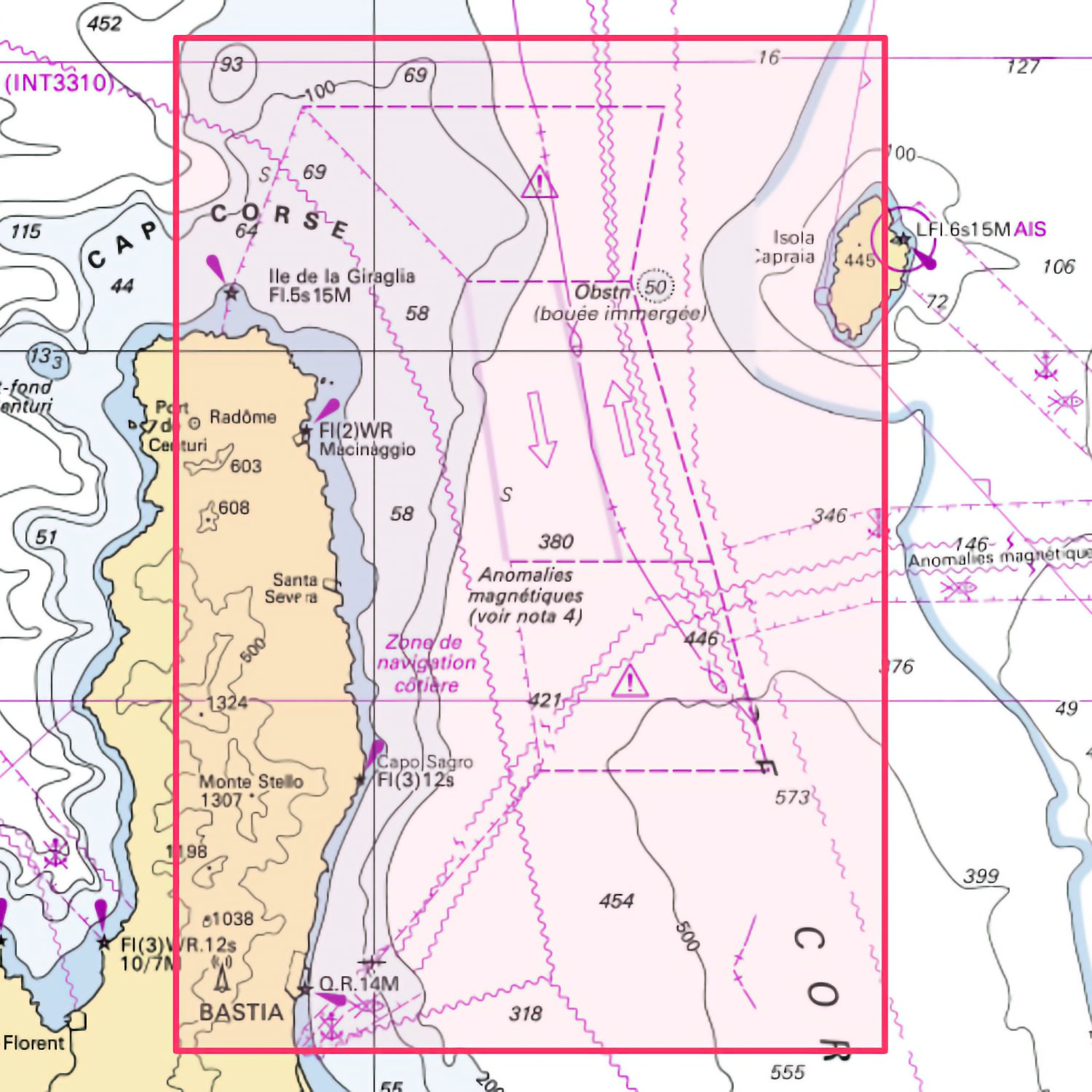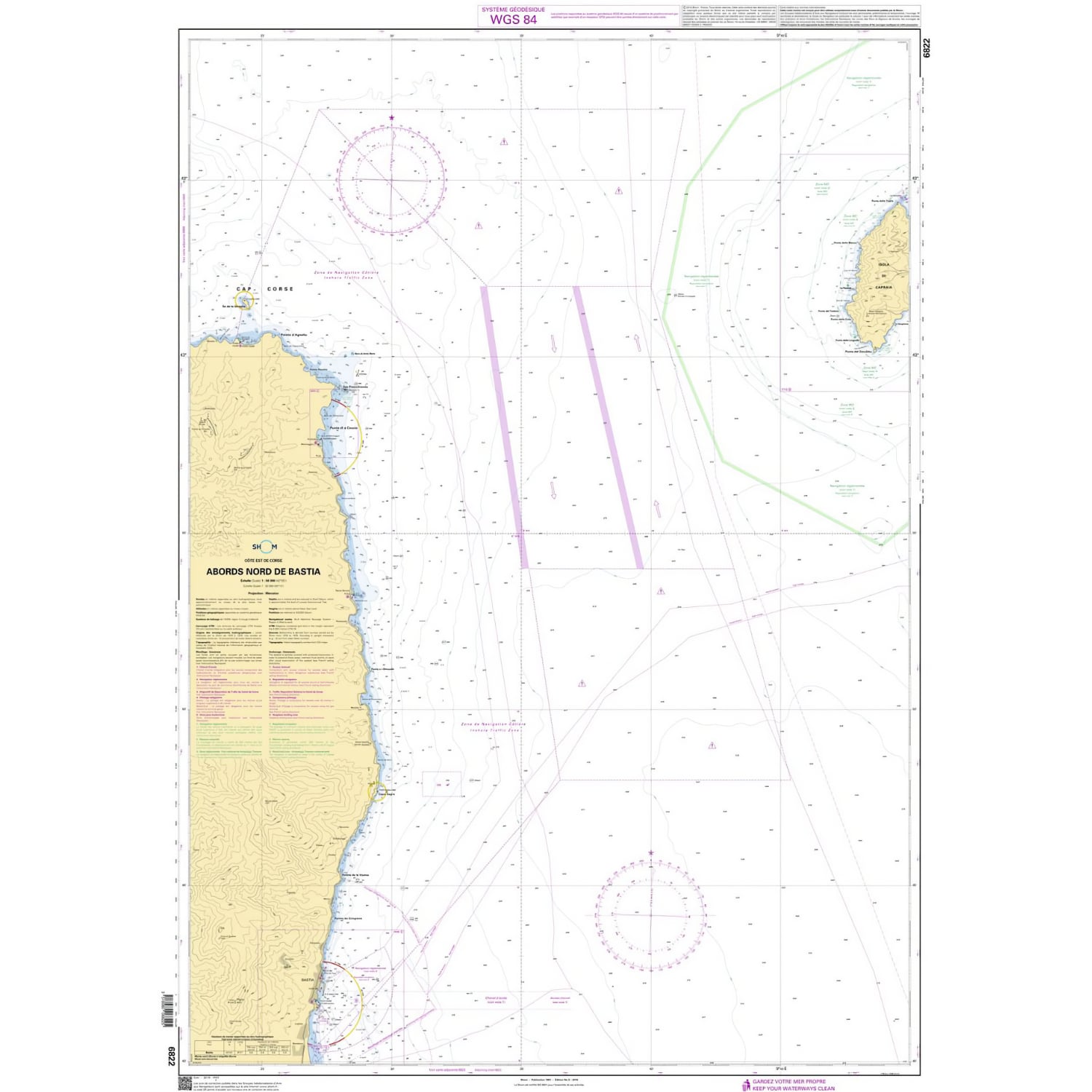 Cette carte marine Shom L couvre les abords nord de Bastia en Méditerranée. Elle appartient à la série des cartes marines pliées au format A4, 21 x 29,7 cm, et mesure une fois dépliée 84 x 119 cm. Elle est établie à l’échelle 1:50 300. Les informations de navigation sont présentées selon les conventions cartographiques classiques. Les unités de mesure utilisées sont le mètre (m). Cette carte intègre les données nautiques issues des bases bathymétriques, du balisage, des épaves, des câbles sous marins et des infrastructures portuaires. Elle est conforme aux normes internationales SOLAS et correspond à la version la plus récente disponible, imprimée à la demande avec les mises à jour intégrées le jour de l’impression.