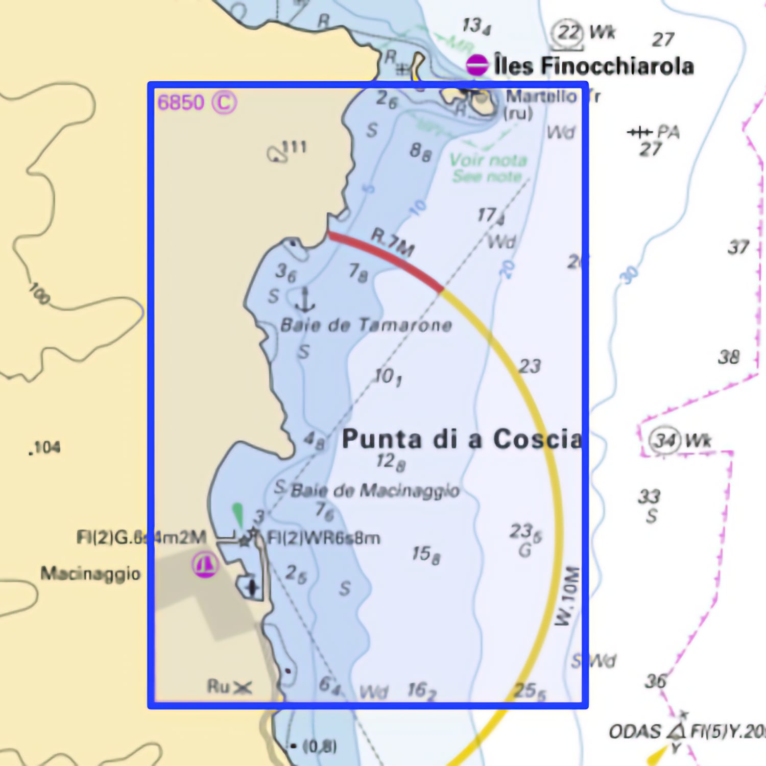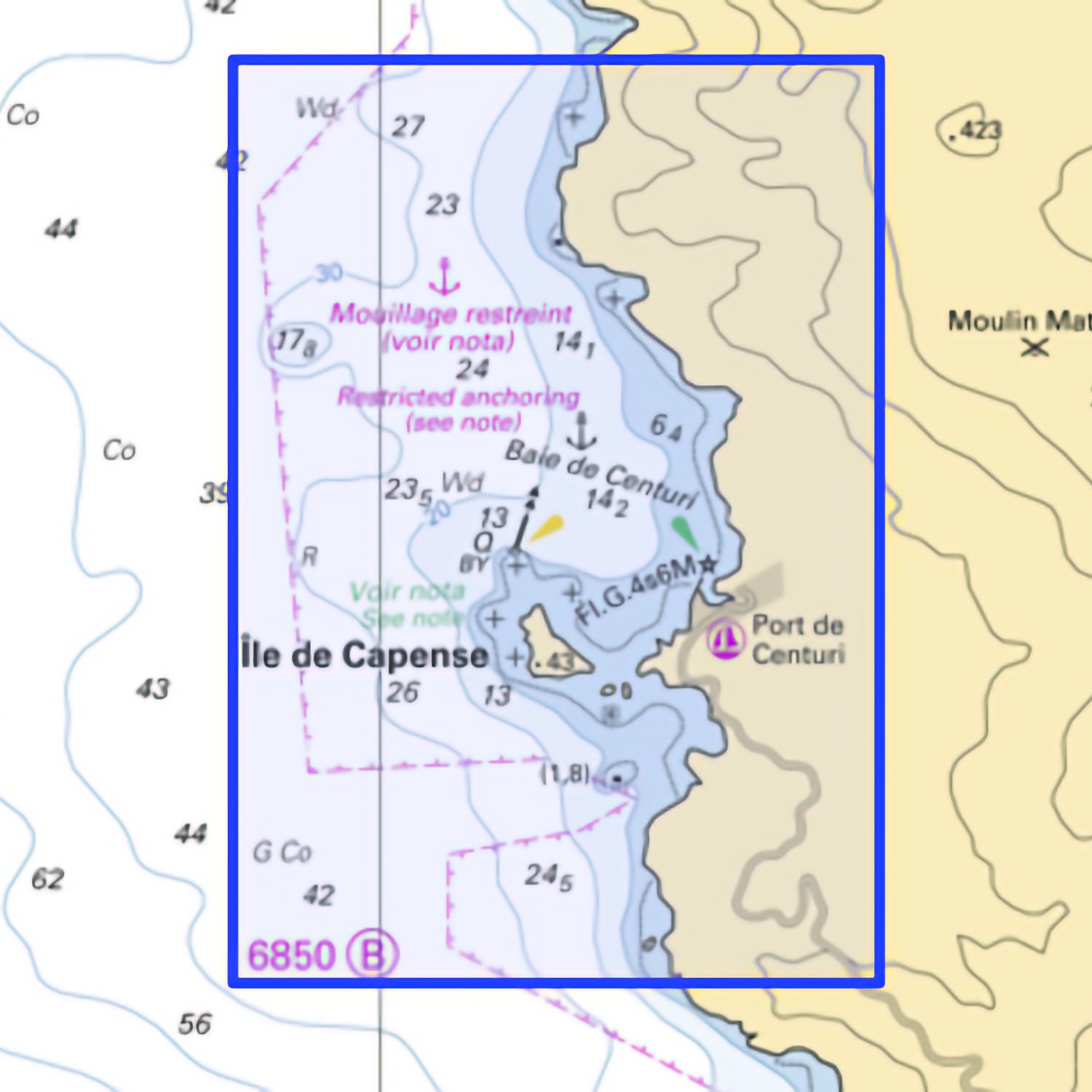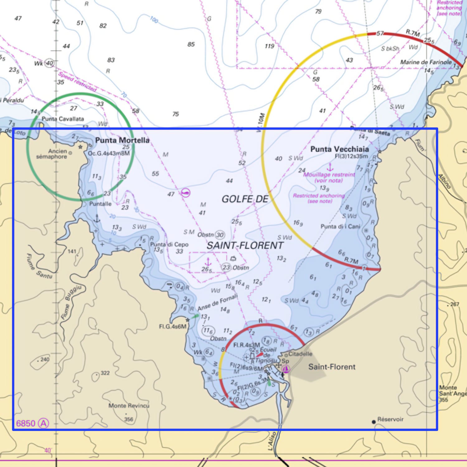 La carte marine officielle française 6850 du Shom couvre la zone de Saint Florent, Centuri et Macinaggio en Méditerranée. Elle appartient à la série Shom L, cartes marines pliées au format A4. Dépliée, elle mesure 84,1 x 118,9 cm. L’échelle est de 1:15000 et l’unité de mesure utilisée est le mètre. La carte fournit les informations nécessaires à la navigation côtière, profondeurs, balisage, phares, dangers, épaves, câbles sous-marins et entrées de ports. Les données sont conformes au système géodésique WGS 84. Cette carte est conforme à la réglementation SOLAS et repose sur des données officielles françaises recueillies et mises à jour par le Shom.