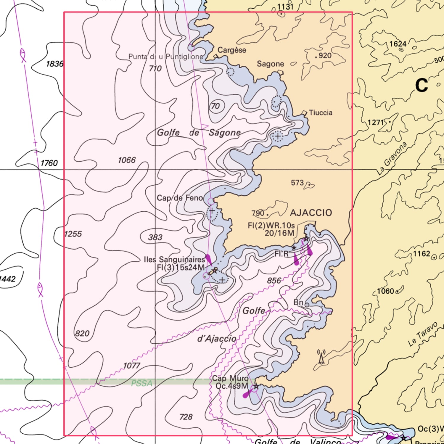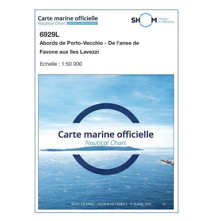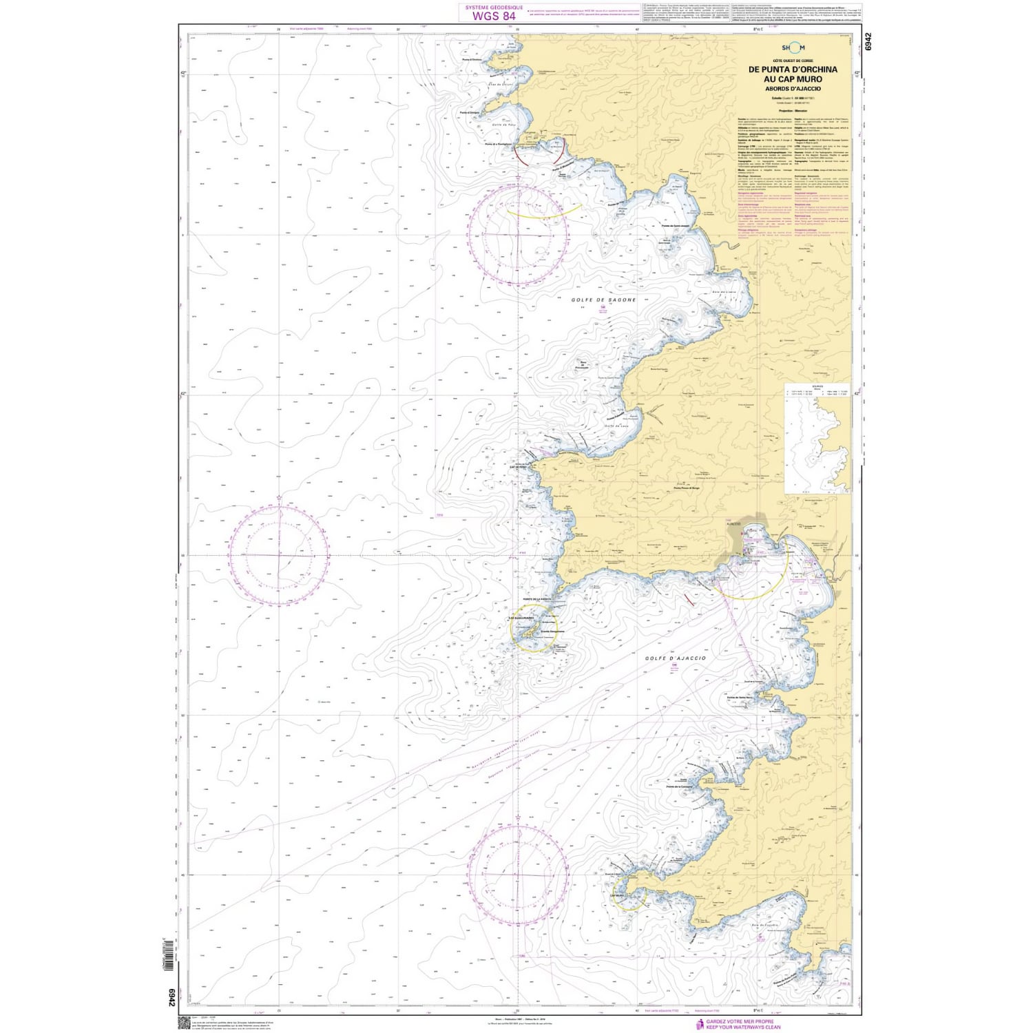 La carte marine Shom 6942L couvre la zone de Punta d’Orchina au Cap Muro, avec les abords d’Ajaccio. Elle fait partie de la série Shom L, des cartes marines pliées au format A4 de 21 x 29,7 cm. Une fois dépliée, la carte atteint le format A0 de 84,1 x 118,9 cm. L’échelle est de 1:51 000, adaptée à la navigation côtière et à la préparation des routes. Les profondeurs sont exprimées en mètres et la carte est établie selon le système géodésique WGS 84. Elle indique les éléments nécessaires à la navigation, comme les sondes, le balisage, les phares, les amers et les entrées de ports. Il s’agit d’une carte officielle française issue des données du Service hydrographique et océanographique de la marine, mise à jour grâce à un service d’impression à la demande intégrant les corrections en cours.