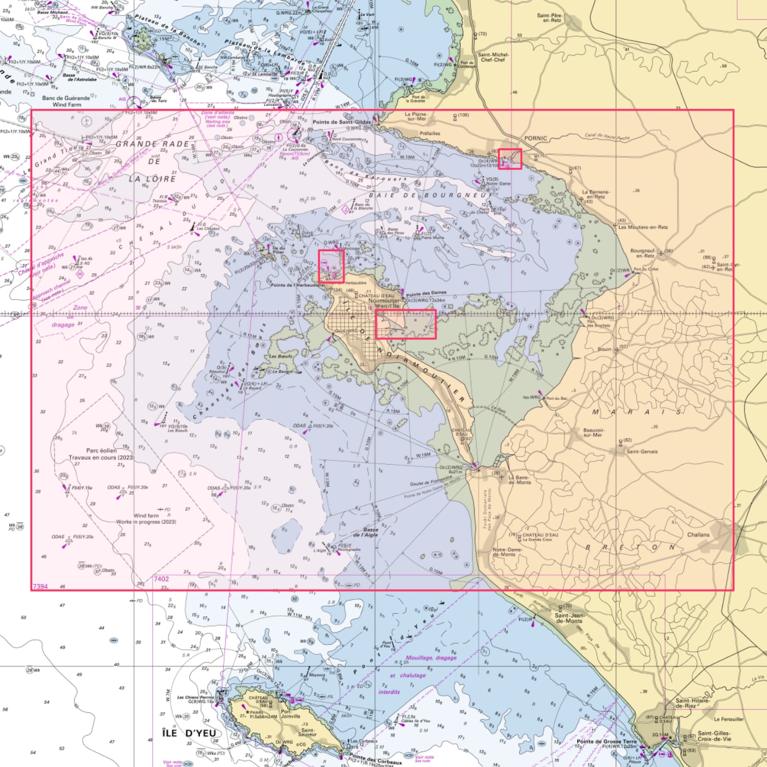 La carte marine Shom 7394L couvre la zone de la Pointe de Saint-Gildas au Goulet de Fromentine, incluant la Baie de Bourgneuf. Elle est produite par le Service hydrographique et océanographique de la Marine (Shom), organisme officiel français. Cette carte est proposée pliée au format A4 (21 x 29,7 cm) et dépliée au format A0 (84,1 x 118,9 cm). Son échelle de 1:50 000 permet un usage précis en navigation côtière et lors des entrées portuaires.Le support papier est renforcé par un traitement au latex, garantissant une résistance aux projections d’eau et aux conditions humides, tout en permettant le report, l’écriture et l’effacement des routes de navigation. Conforme aux normes SOLAS (Safety of Life at Sea), la carte repose sur le système de référence WGS84 et compile des données bathymétriques, de balisage, d’épaves, de câbles sous-marins et d’infrastructures portuaires. Elle est tenue à jour quotidiennement et imprimée à la demande afin d’intégrer les corrections et réglementations les plus récentes.