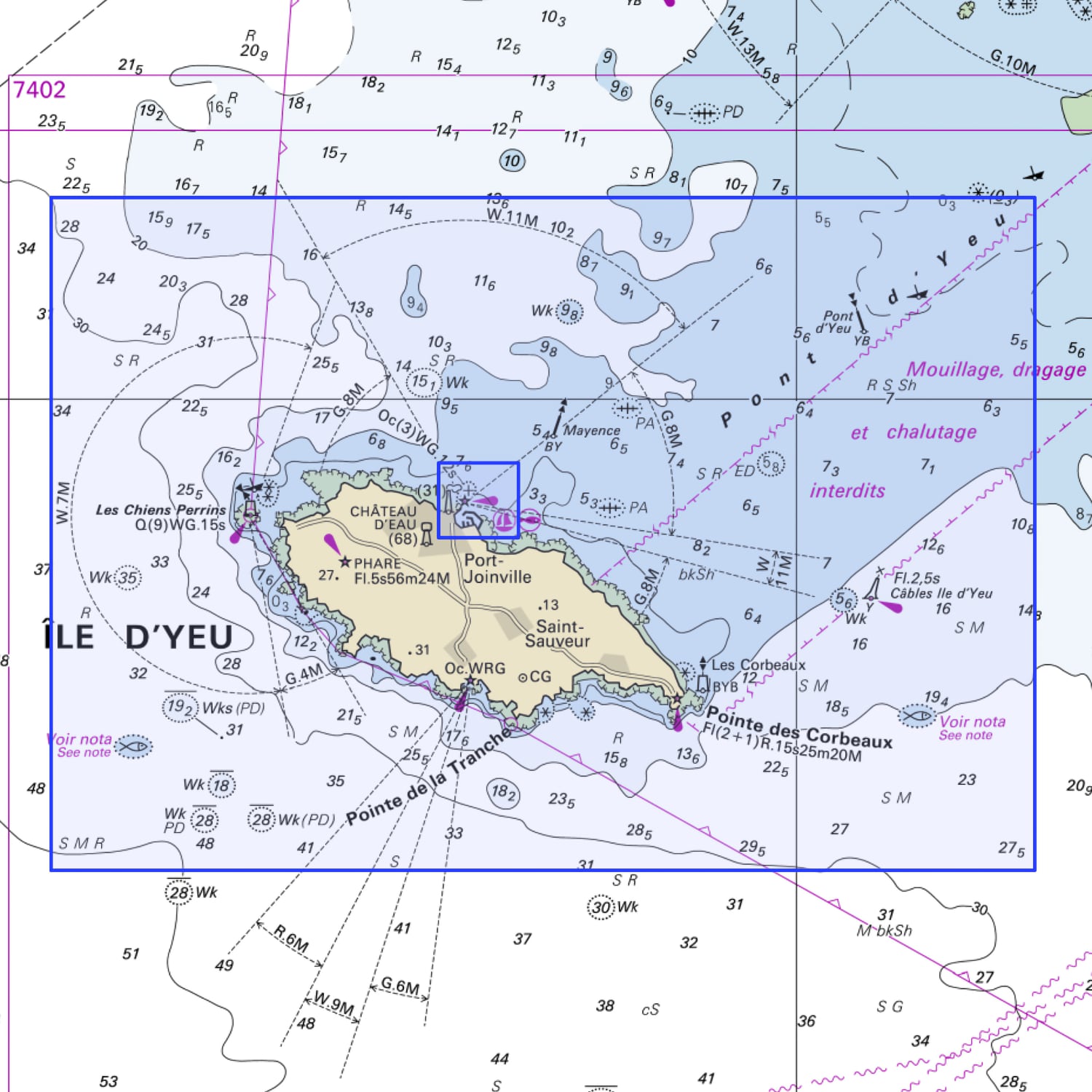 La carte marine Shom 7410L couvre la zone de l’océan Atlantique autour de l’Île d’Yeu. Elle est éditée par le Service hydrographique et océanographique de la Marine (Shom), organisme officiel français. Cette carte est proposée pliée au format A4 (21 x 29,7 cm) et dépliée au format A0 (84,1 x 118,9 cm). Son échelle de 1:20 000 fournit un haut niveau de détail, adapté à la navigation côtière fine, aux abords immédiats de l’île et aux entrées de ports. Le support est imprimé sur un papier chargé de latex, offrant une résistance renforcée aux conditions humides tout en permettant le report et l’effacement des tracés de navigation. Conforme aux normes SOLAS (Safety of Life at Sea) et basée sur le système WGS84, la carte intègre les données officielles : bathymétrie, balisage, phares, câbles sous-marins, épaves et infrastructures portuaires. Imprimée à la demande, elle bénéficie des corrections quotidiennes du Shom.