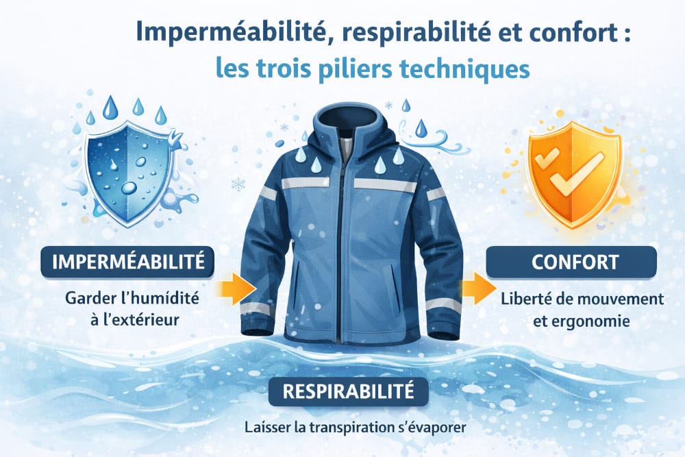 On attend d’une veste de quart trois performances majeures : l’imperméabilité, la respirabilité et le confort.