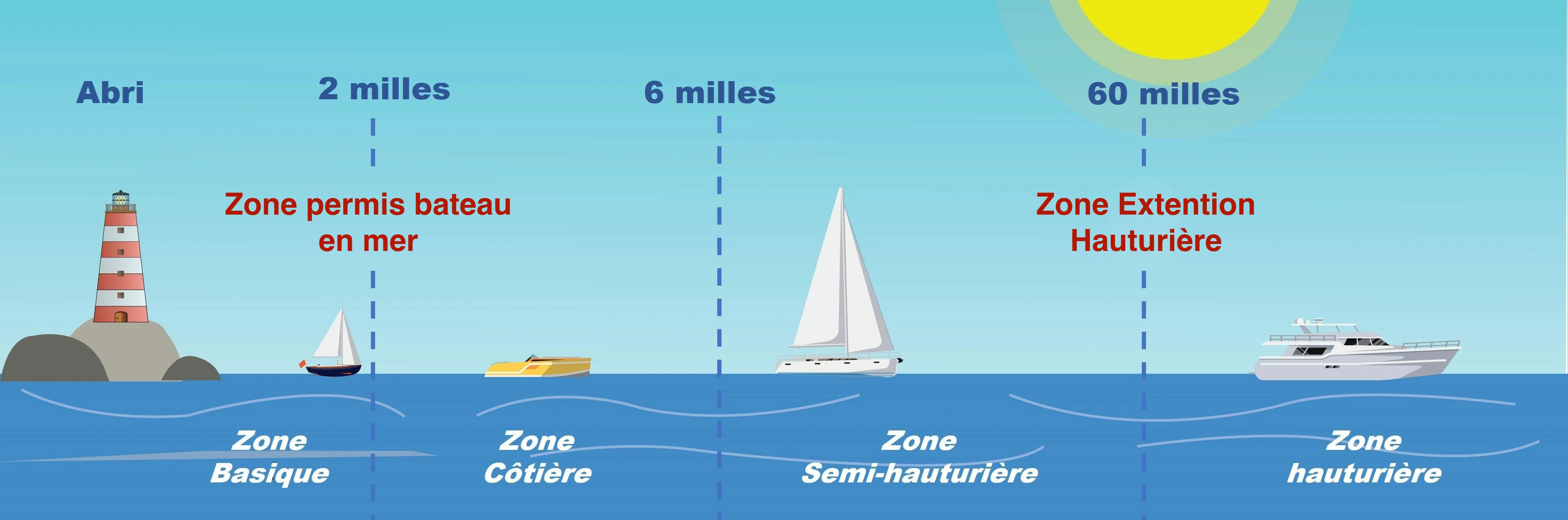 La règle de base est l’éloignement d’un abri, avec quatre zones utilisées en plaisance. Les deux premières sont accessibles avec un permis bateau option côtière : la zone Basique jusqu’à 2 milles d’un abri et la zone côtière, de 2 à 6 milles. Les deux zones suivantes nécessitent l'extension hauturière (permis hauturier) : la zone semi-hauturière de six à soixante milles et la zone hauturière au-delà de 60 milles.