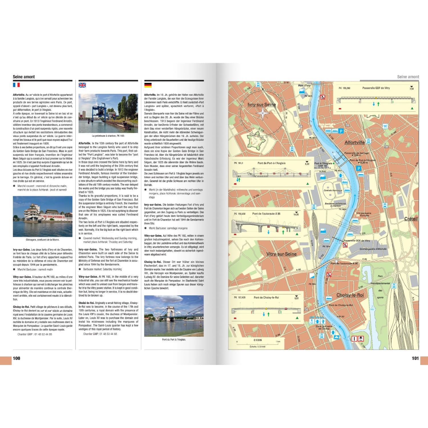 La Seine offre un itinéraire long de plus de 700 kilomètres, depuis l’estuaire jusqu’à l’amont, en traversant des milieux très variés — zones maritimes, vallée fluviale, milieu urbain parisien, puis campagnes. Le guide aide le plaisancier à naviguer dans le trafic commercial croissant tout en respectant les consignes des éclusiers et de l’organisation de la navigation. Pour éviter la densité du trafic à Paris, le guide propose les canaux secondaires (canal Saint-Denis, canal Saint-Martin, canal de l’Ourcq) comme alternatives adaptées aux petites embarcations. Chaque pont, chaque écluse, chaque voie d’eau est décrite avec ses contraintes (tirant d’eau, hauteur sous pont, sens de circulation), ses accès portuaires, ainsi que les haltes possibles.