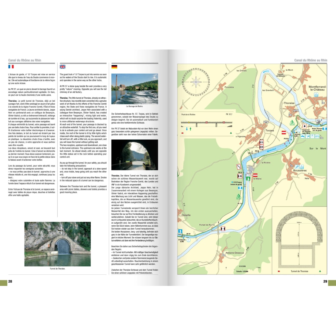 Le guide couvre l’intégralité du parcours navigable du canal du Rhône au Rhin, depuis Saint-Symphorien jusqu’au Rhin, en passant par le Doubs canalisé et l’embranchement de Belfort. Ce guide au format A4 (21 x 29,7 cm) comprend 72 pages avec une cartographie détaillée à l’échelle 1/50 000 pour les canaux et 1/25 000 pour les rivières. Il présente les particularités de chaque section : voies artificielles, biefs de partage, vallées, collines jurassiennes ou encore plaine de la Saône. Les cartes sont enrichies de données nautiques à jour et d’informations utiles pour la navigation fluviale. Trilingue (français, anglais, allemand), le guide est publié par les Éditions du Breil.