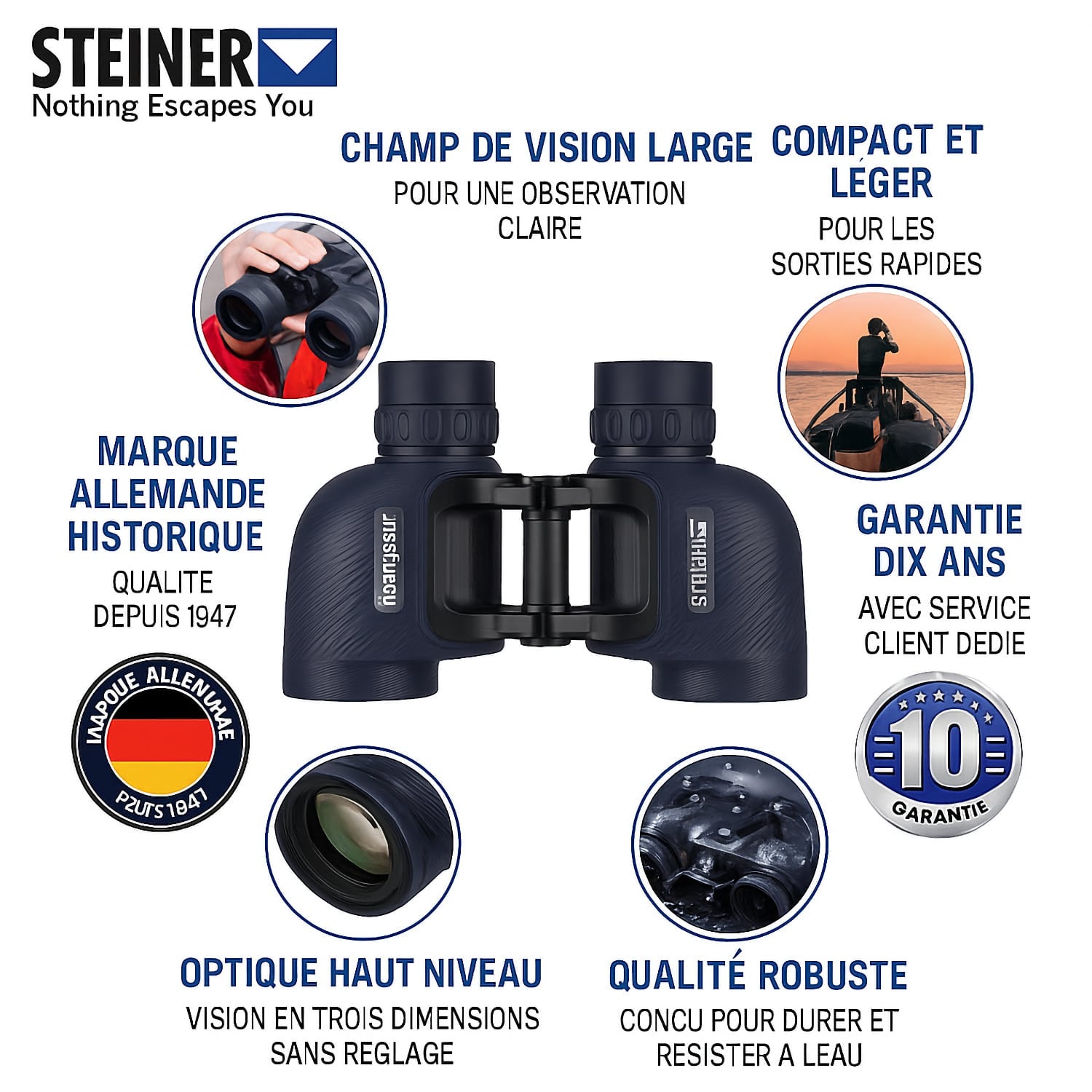 Les Steiner Navigator 7x30 sont conçues pour une utilisation nautique. Compactes et résistantes, elles intègrent un grossissement de 7X et un objectif de 30 millimètres de diamètre. L’optique High-Contrast offre une image claire, même en cas de faible luminosité. L’autofocus permanent permet une vision nette de 20 mètres à l’infini, sans réglage manuel. Le système à pont ouvert facilite la préhension, même d’une seule main. L’armature externe en polycarbonate Makrolon est recouverte de caoutchouc texturé pour une bonne prise en main, y compris par mer agitée. L’étanchéité est assurée jusqu’à 5 mètres grâce au remplissage à l’azote. Le système à double soupape évite toute condensation interne, même entre -20 et + 70 degrés.