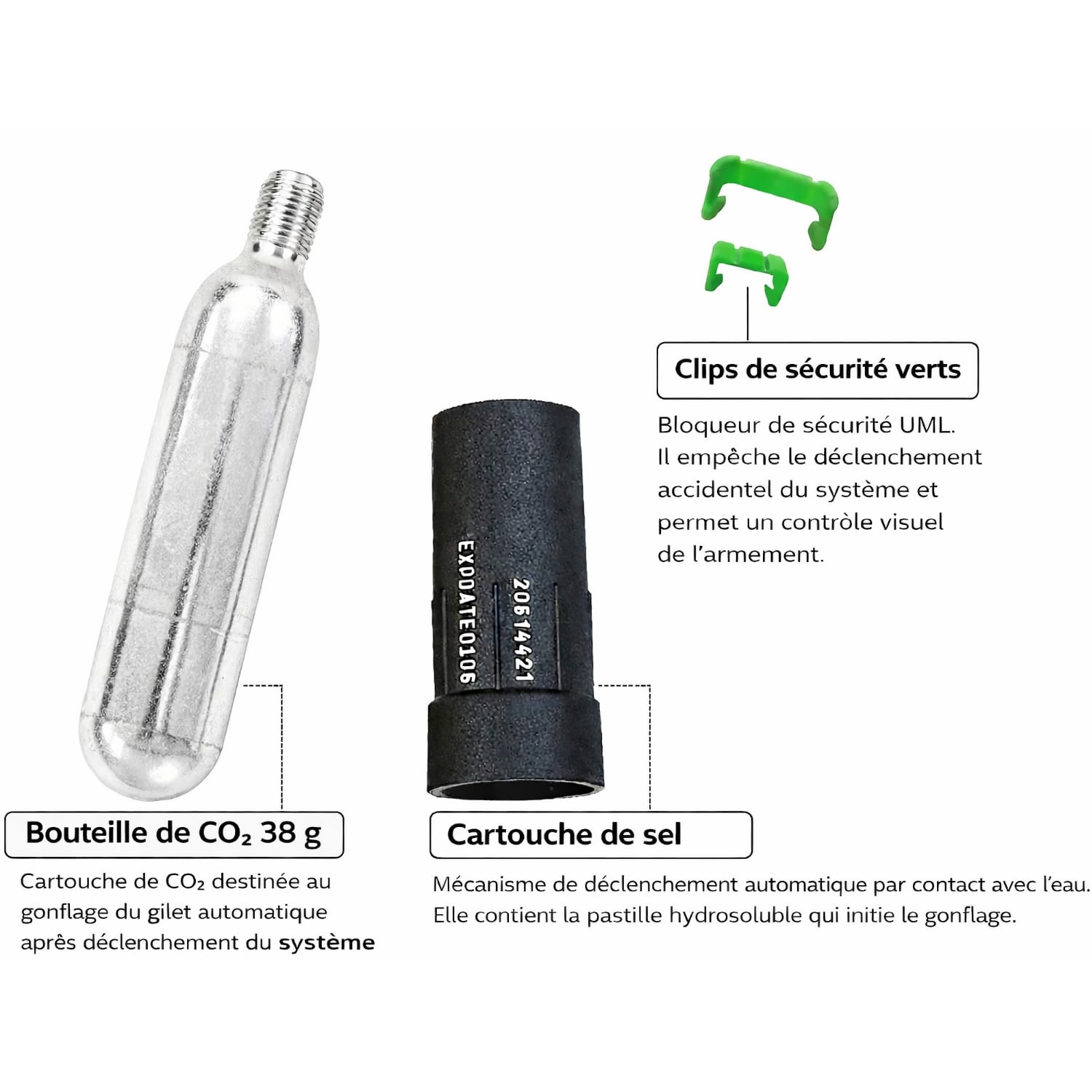 Ce kit de réarmement est utilisé après un déclenchement automatique ou manuel du gilet. La cartouche hydrosoluble assure le gonflage automatique au contact de l’eau, même en cas d’incapacité de la personne. La bouteille de CO2 de 38 g fournit le volume de gaz nécessaire au gonflage rapide du gilet. Le clip de sécurité vert permet de vérifier visuellement que le système est armé. La compatibilité avec les modèles 180 N garantit le respect des caractéristiques de flottabilité prévues par le fabricant, ce qui est essentiel pour conserver un équipement conforme et fonctionnel lors des sorties en mer ou en eaux intérieures.