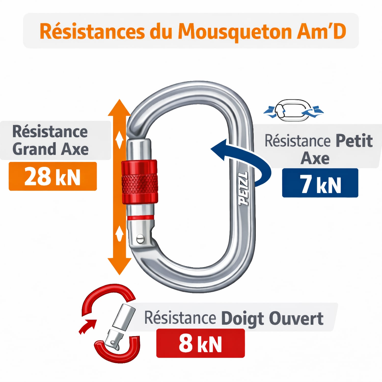 Le mousqueton Am’D Screw-Lock de Petzl est conçu en aluminium avec une forme asymétrique en D. Ce profil optimise la résistance mécanique tout en assurant un poids réduit. Sa structure favorise la connexion efficace d’un système d’assurage ou le transport de matériel. Le système de verrouillage à vis Screw-Lock permet une sécurisation manuelle, fiable dans toutes les conditions, y compris en port de gants. Le système Keylock évite tout accrochage involontaire lors des manipulations. L’ouverture du doigt atteint 25 mm Ce mousqueton est certifié selon plusieurs normes techniques : CE EN 12275, EN 362, UIAA, EAC, NFPA 2500 Technical Use, GB/T 23469. Il pèse 70 g. Résistance sur grand axe : 27 kN, petit axe : 8 kN, doigt ouvert : 7 kN