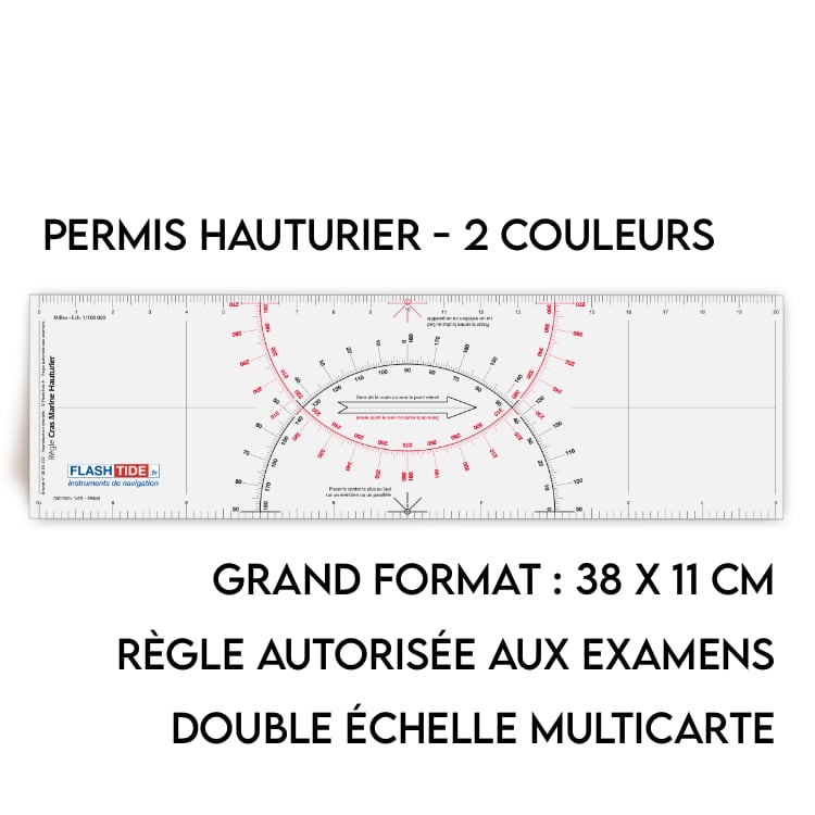 • Règle Cras Marine Hauturier bicolore : La Règle Marine Hauturière de Flash-Tide est un modèle de règle Cras bicolore rouge et noire très apprécié par les plaisanciers et les candidats au permis hauturier, car elle est plus pratique et plus lisible que le dessin original de l'Amiral Jean Cras. Elle facilite la lecture et le traçage des caps, des routes et des relèvements. Mesurant 380 x 110 mm, la règle Cras a été homologuée par la Marine marchande, la Marine nationale, l'Aviation civile et l'Armée de l'air, ce qui signifie qu'elle a été reconnue comme conforme aux normes et aux exigences de ces organismes.