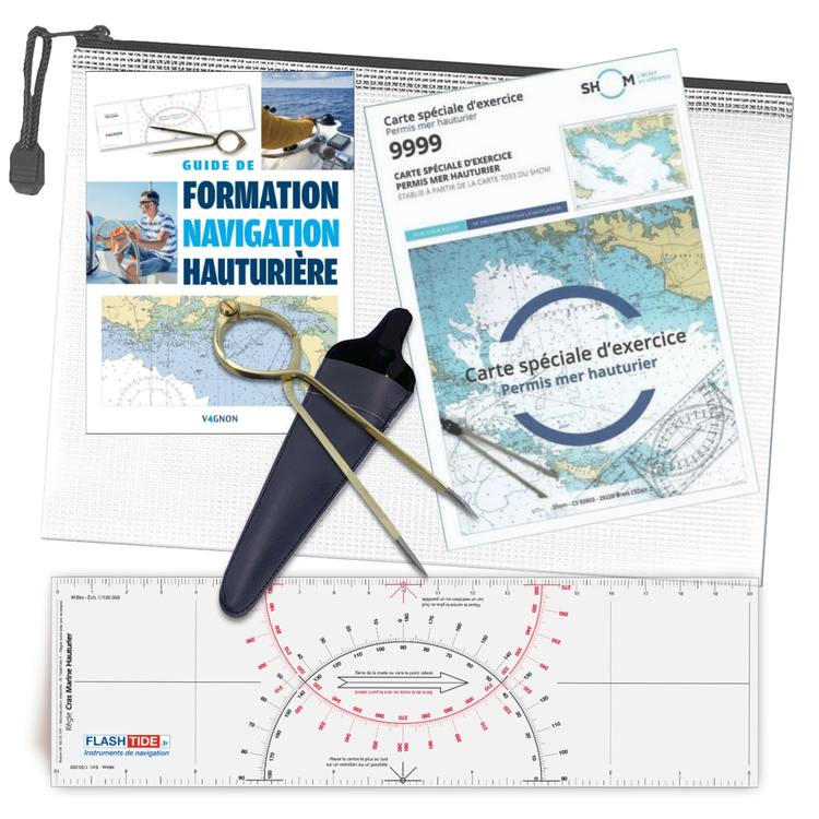 Le kit complet pour réussir votre permis plaisance hauturier : Ce pack réunit tous les outils indispensables à la préparation de l’examen : Manuel de formation à navigation hauturière, règle Cras, compas laiton de 20 cm, carte SHOM 9999 (carte test officielle) et une pochette de rangement pratique. Conforme aux exigences de la formation, il s’adresse à tous les candidats souhaitant s’entraîner efficacement à la navigation marine au-delà de 6 milles.
