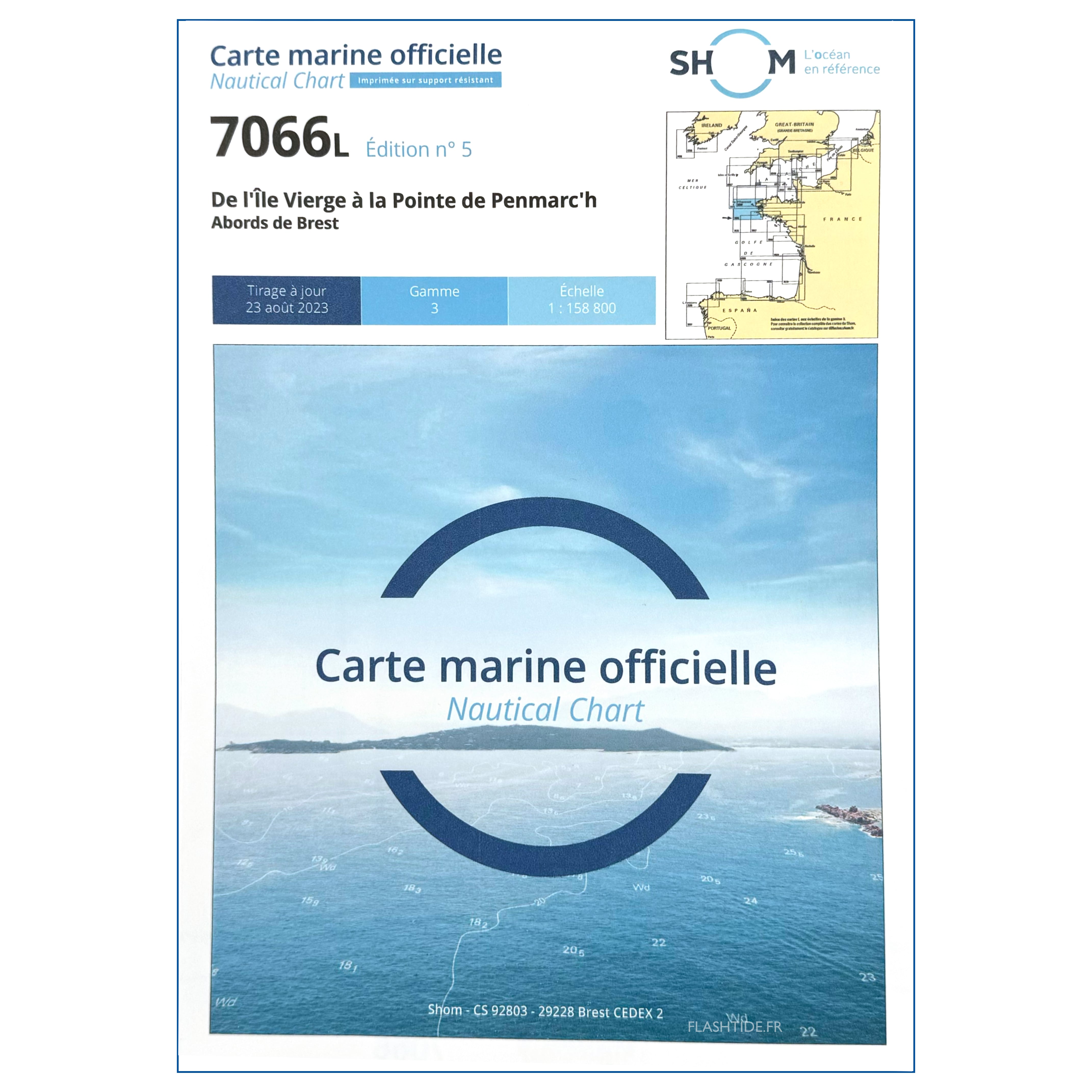 • Carte SHOM 7066L Edition N°5 (de l'Ile vierge à la pointe de penmarc'h : La carte marine du SHOM 7066L est la carte officielle d'examen du capitaine 200 qui permet de naviguer au-delà de 6 milles d'un abri. C'est également sur cette carte que vous ferez l'ensemble des exercices pour vous préparer aux épreuves de l'examen.