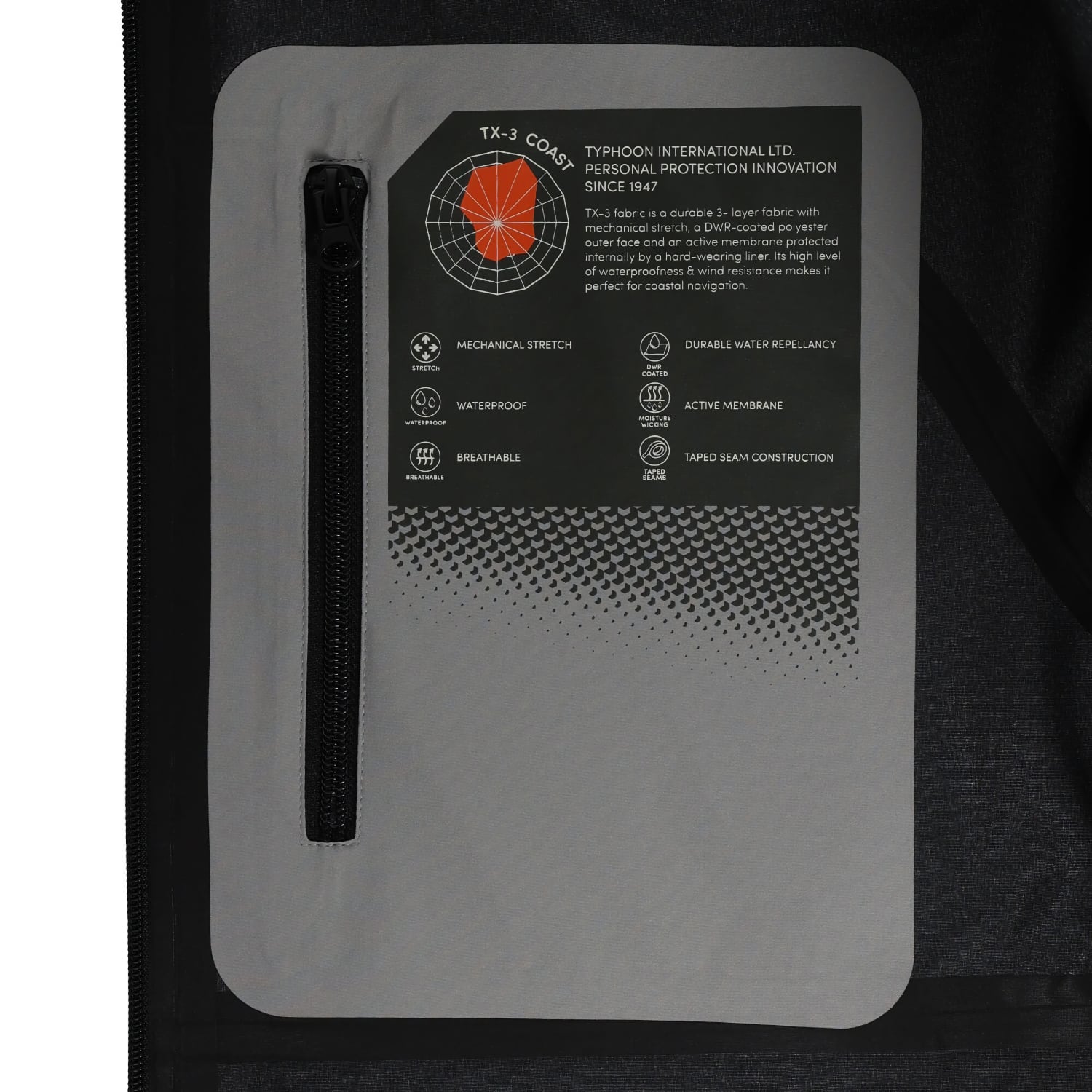 La veste Performance est conçue pour la navigation côtière, que ce soit à la voile ou en bateau à moteur. Elle est fabriquée en tissu polyester TX-3 DWR à trois couches avec enduction déperlante durable. Le textile présente une élasticité mécanique, ce qui améliore la mobilité. Les coutures sont entièrement étanchées pour garantir une protection continue face aux projections d’eau. Les zips sont déperlants et les poignets ajustables sont doublés en polyuréthane pour limiter les infiltrations. La veste n’est pas doublée, ce qui réduit le poids et améliore la souplesse. Un col haut doublé polaire renforce l’isolation thermique au niveau du cou. Une capuche escamotable est intégrée dans le col. La conception est complétée par des poches poitrine (intérieure et extérieure) et des marquages réfléchissants pour la visibilité. Étanchéité mesurée à 10 000 millimètres de colonne d’eau, respirabilité à 10 000 g/m²/24 par jour.