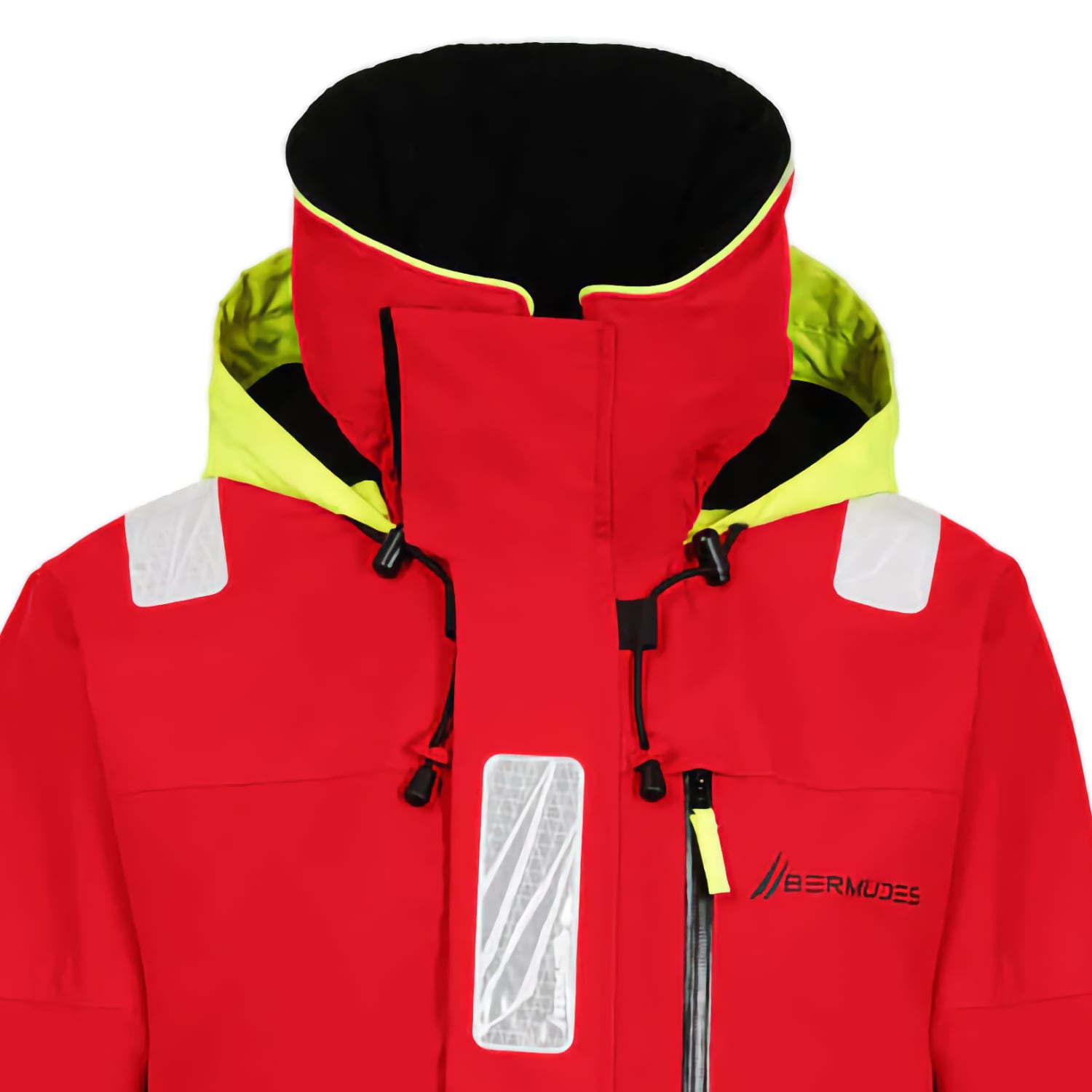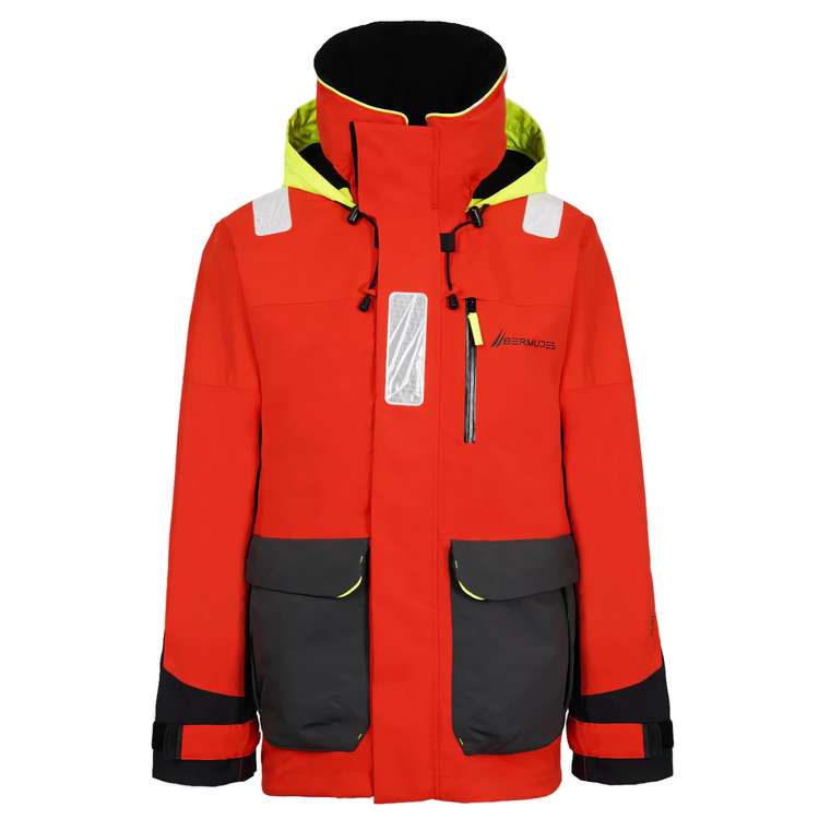 La veste de quart Inshore Bermudes est conçue en polyester recyclé enduit PU avec une doublure mesh. Le tissu est imperméable et respirant, avec une imperméabilité annoncée de 10 000 mm et une respirabilité de 10 000 g par mètre carré sur 24 heures. Les coutures sont entièrement étanches et le tissu reçoit un traitement déperlant DWR sans PFC afin de limiter la saturation par l’eau. La veste dispose d’un col haut doublé polaire, d’une capuche attenante réglable et d’une ouverture frontale zippée protégée par une double patte avec fermeture velcro. Les bas de manches sont réglables et équipés de manchons intérieurs en polyuréthane. Des renforts sont intégrés aux coudes et au bas du dos pour limiter l’usure. La visibilité est renforcée par des bandes rétro réfléchissantes positionnées à l’avant, aux épaules et aux bas de manches. L’ensemble comprend six poches, dont deux poches plaquées à double entrée, une poche poitrine et une poche intérieure. La longueur mesurée en taille L est de 84 centimètres.